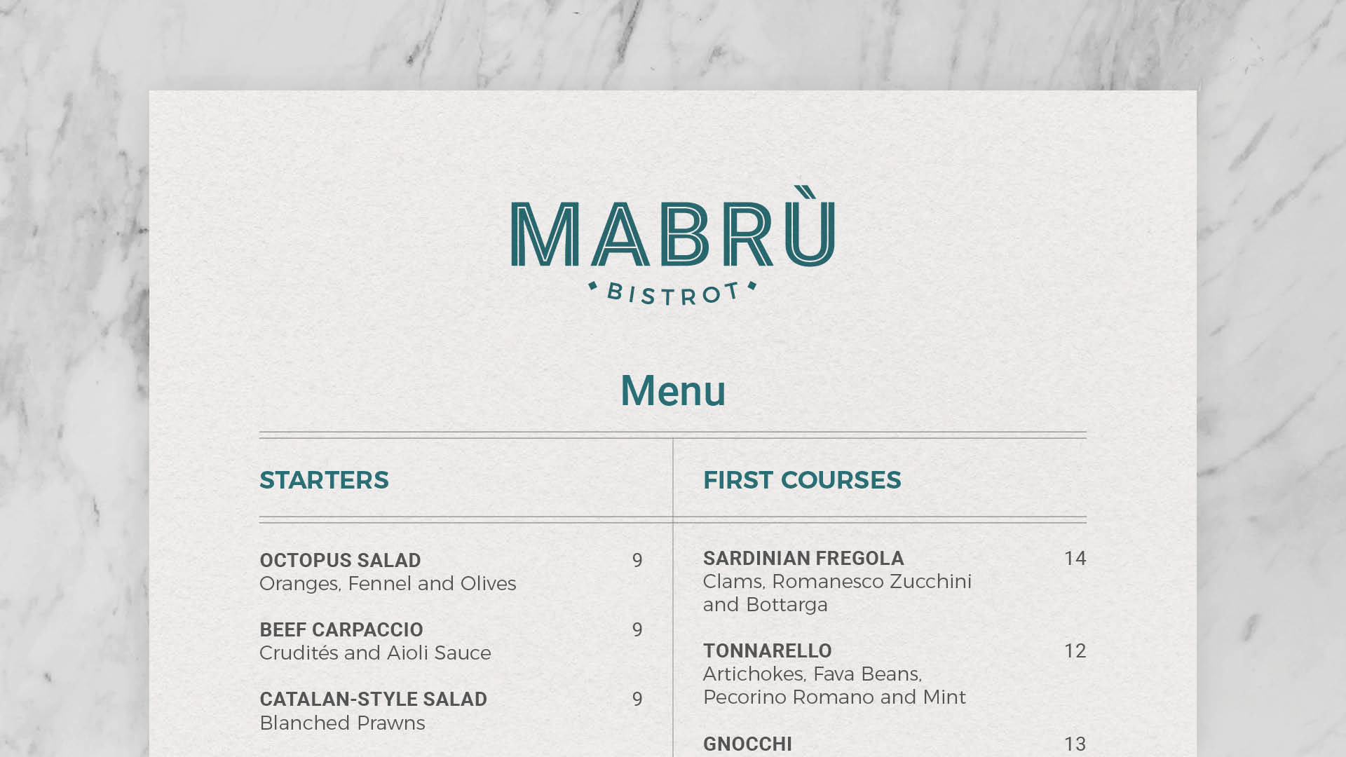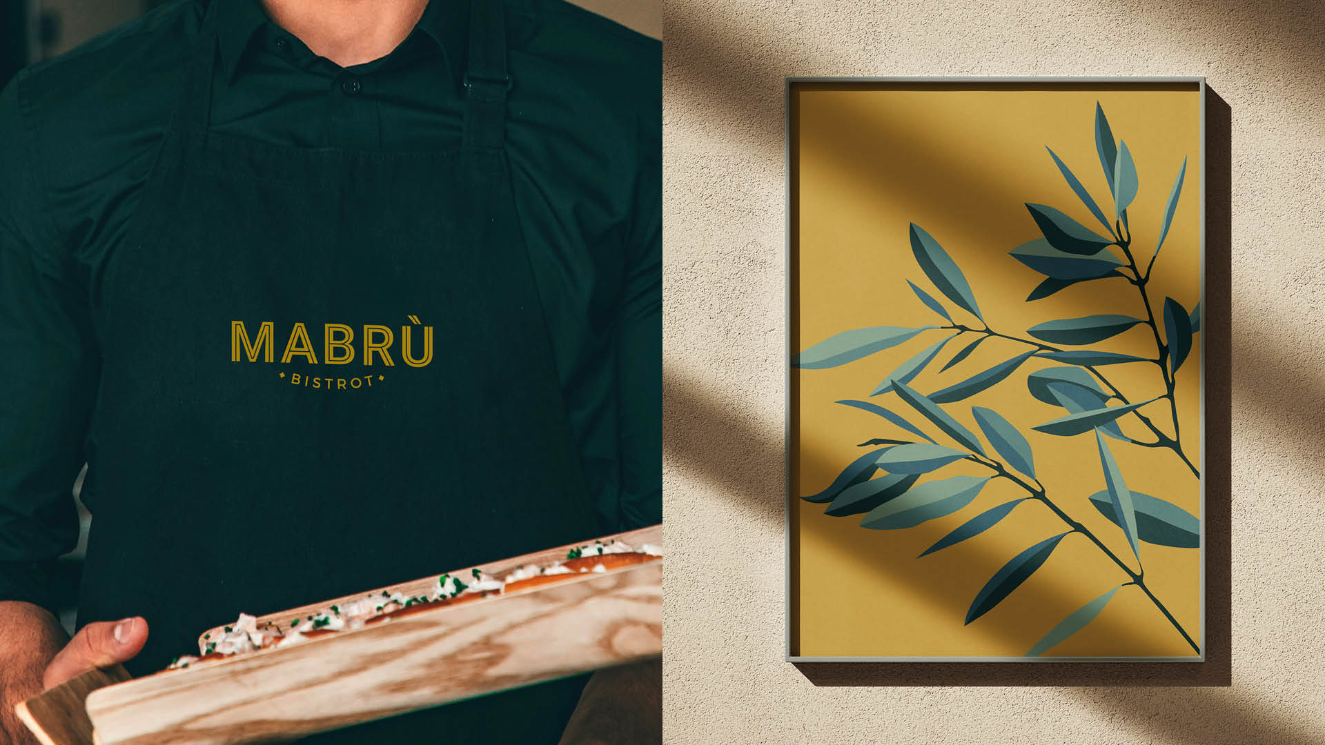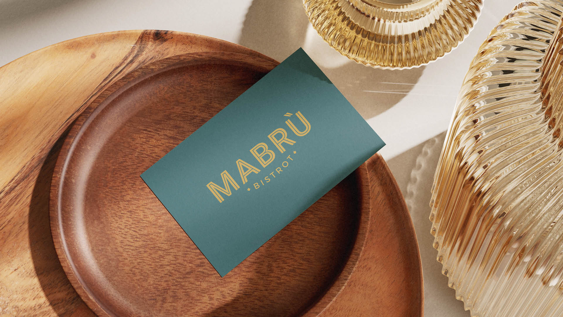 Mabrù is an Italian bistrot balancing tradition and innovation, combining seasonal ingredients with classic flavours. This dual spirit informs the visual identity, inspired by Italian Art Deco. Geometric shapes and repeated lines create rhythm and structure, blending elegance with contemporary clarity.
